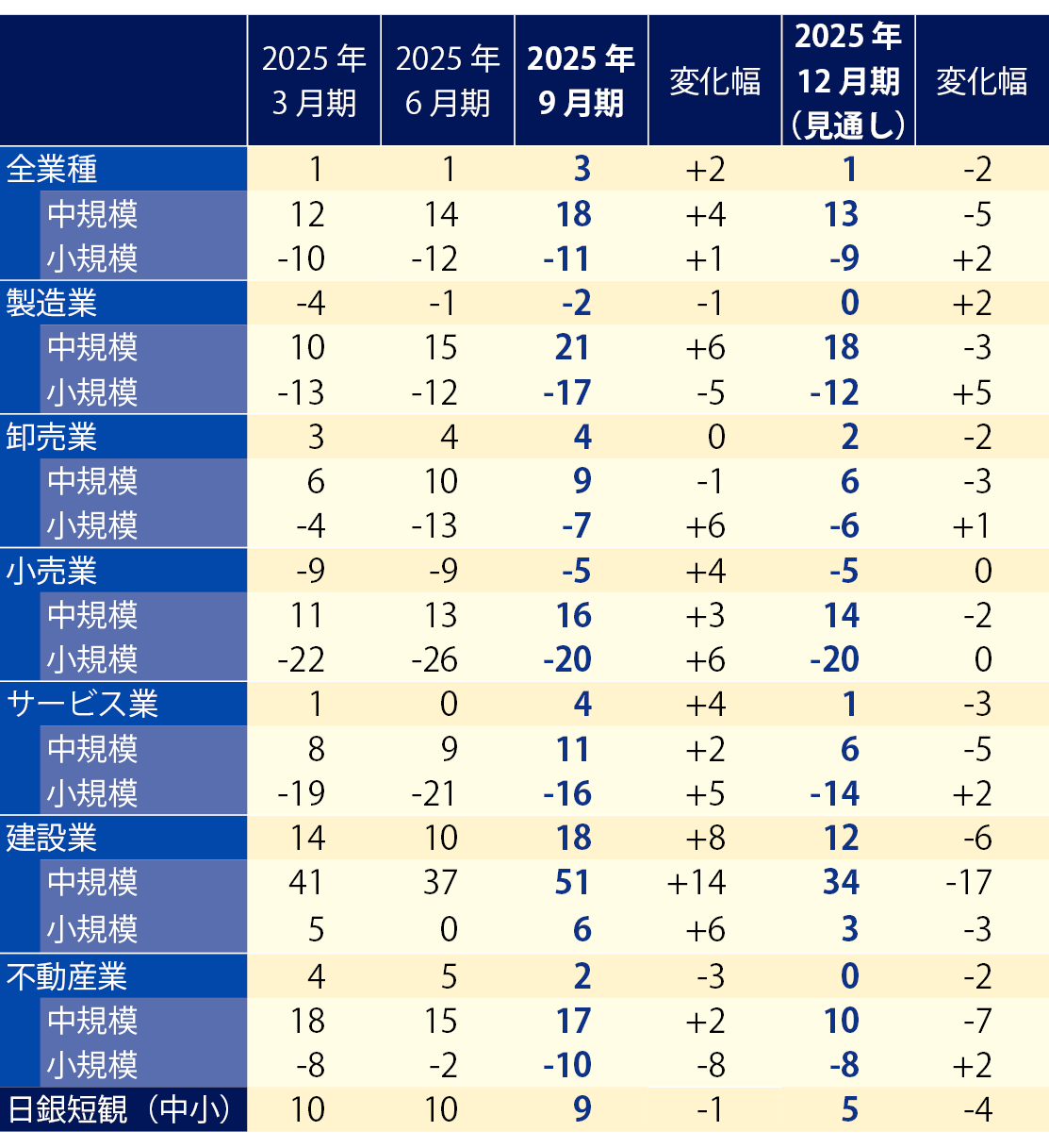 規模別に見ると、中規模企業では4ポイント上昇の18となったものの、小規模企業では1ポイント上昇のマイナス11となり、小幅改善にとどまった。